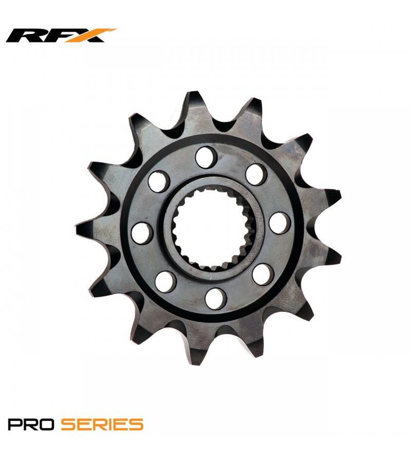 Τα γρανάζια RFX Pro, έχουν επίστρωση Black Zinc, και είναι φτιαγμένα από ατσάλι υψηλής ποιότητας με σκληρότητα 60 Rockwell, για να αντέχουν στην φθορά και να εξασφαλίζουν μεγάλη διάρκεια ζωής. Τα λούκια ανάμεσα από τα δόντια, βοηθούν να μην συσσωρεύεται η βρωμιά και η λάσπη, παρατείνοντας την διάρκειας ζωής του γραναζιού και της αλυσίδας κίνησης. Επίσης η επίστρωση Black Zinc δινει ένα μαύρο χρώμα στο γρανάζι, και το βοηθάει να μην διαβρώνεται από τα πλυσίματα και το πέρας του χρόνου, δίνοντας παράλληλα ένα Factory Look στο μηχανάκι σας. CNC Επεξεργασία. Lightweight Σχεδιασμός. Black Zinc Επίστρωση. Aυτοκαθαριζόμενο. Σκληρότητα 60 Rockwell