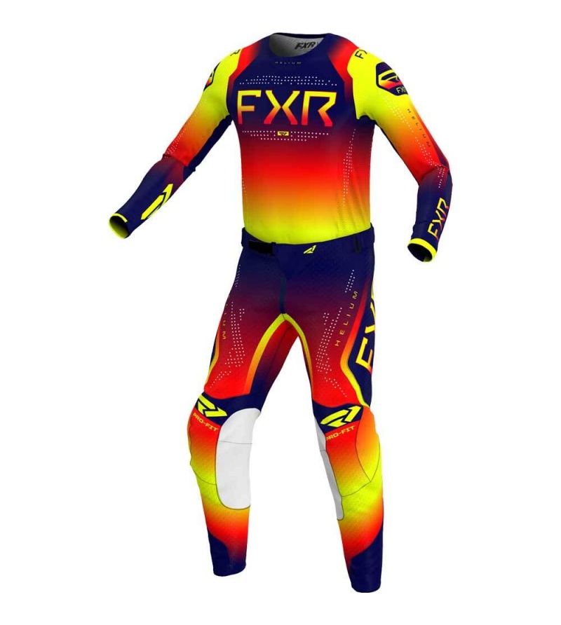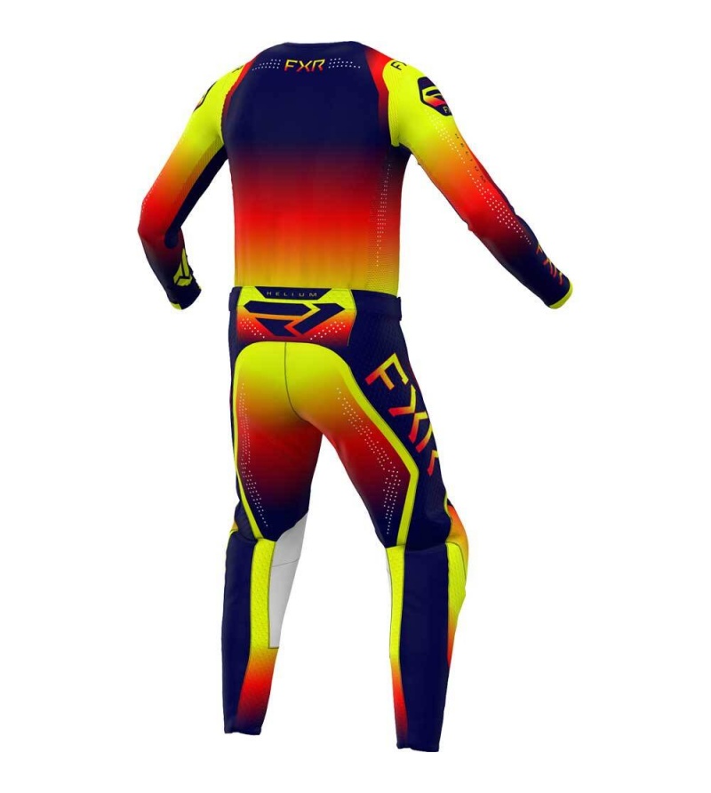 FXR Helium Χαρακτηριστικά Μπλούζας: Ελαφρύ πλέγμα πολυεστέρα / spandex για αυξημένη διαπνοή και άνεση του αναβάτη Στενή εφαρμογή Μανσέτες με συγκολλημένες ραφές για μείωση της τριβής Σχηματισμένος μπροστινός γιακάς για βελτιωμένη άνεση Οι ίνες που απορροφούν την υγρασία προσφέρουν γρήγορη απόδοση στεγνώματος Μακρύ πίσω στρίφωμα και μεγάλο μήκος για προστασία από την έκθεση της μέσης Εκτυπώσεις εξάχνωσης που δεν ξεθωριάζουν Χαρακτηριστικά Παντελονιού: Σχεδιασμός M-3 για κορυφαία εφαρμογή και κινητικότητα του αναβάτη Κύριο κέλυφος κατασκευασμένο από ελαφρύ ύφασμα 4 κατευθύνσεων για υψηλά επίπεδα ευελιξίας, αντοχής και διάρκειας Σύστημα κλεισίματος μέσης με μεταλλικό καστάνια για ακριβή και ασφαλή εφαρμογή Ανθεκτική κατασκευή πίσω καθίσματος Σχεδιασμός γονάτων με στενή εφαρμογή και πρόσθετη προ-καμπύλη για λιγότερους περιορισμούς και θετική περιοχή επαφής Διπλό στρώμα υφάσματος στα γόνατα με δέρμα πλήρους κόκκου και ανθεκτικό στην τριβή εσωτερικό ύφασμα Ρυθμιζόμενο σύστημα μέσης με hook and loop για εξατομικευμένη εφαρμογή Ελαφριά αναπνεύσιμα ένθετα πλέγματος στο πίσω μέρος του ποδιού για επιπλέον αερισμό Τριπλές ραφές σε κρίσιμες περιοχές για επιπλέον αντοχή και διάρκεια Νέα εσωτερική ελαστική μέση με εκτύπωση σιλικόνης για επιπλέον κράτημα και ασφάλεια Η επένδυση από πλέγμα έχει αφαιρεθεί για καλύτερη διαπνοή και άνεση Εκτυπώσεις εξάχνωσης που δεν ξεθωριάζουν
