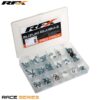Το σετ της RFX Race Series εμπεριέχει προϊόντα όπου πληρούν ή υπερβαίνουν τις προδιαγραφές OEM. Αυτό το σετ είναι ιδανικό για να το έχετε εργαλειοθήκη, στο γκαράζ ή στο van σας γιατί μπορείτε να βρείτε την βίδα, το παξιμάδι ή την ροδέλα που σας λείπει για φτιάξετε το μηχανάκι σας χωρίς καμία καθυστέρηση. Περιλαμβάνονται οι βίδες, τα παξιμάδια, οι ροδέλες για τα πλαστικά και τα φτερά.