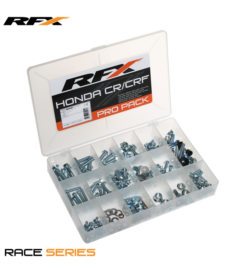 Το σετ της RFX Race Series εμπεριέχει προϊόντα όπου πληρούν ή υπερβαίνουν τις προδιαγραφές OEM. Αυτό το σετ είναι ιδανικό για να το έχετε εργαλειοθήκη, στο γκαράζ ή στο van σας γιατί μπορείτε να βρείτε την βίδα, το παξιμάδι ή την ροδέλα που σας λείπει για φτιάξετε το μηχανάκι σας χωρίς καμία καθυστέρηση. Περιλαμβάνονται οι βίδες, τα παξιμάδια, οι ροδέλες για τα πλαστικά και τα φτερά.