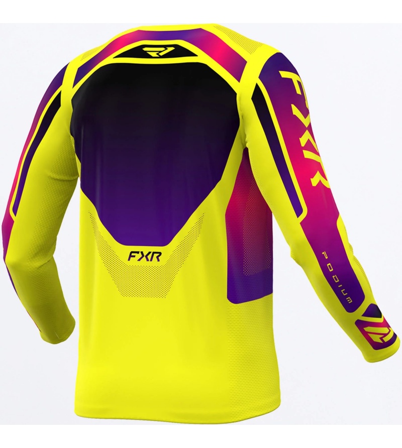 FXR Μπλούζα Podium Relay MX Χαρακτηριστικά: Ελαφρύ πλέγμα από πολυεστέρα-spandex σε συνδυασμό με υψηλής απόδοσης πλεκτό πολυεστέρα Σχεδιασμός slim fit για μοντέρνα, εφαρμοστή γραμμή Εργονομικός γιακάς μπροστά και μανσέτες σε κωνικό σχήμα Μακρύτερο πίσω τελείωμα (drop-tail) και επιπλέον μήκος για προστασία της μέσης Ανεξίτηλα γραφικά sublimation που διατηρούν τα χρώματα ζωντανά