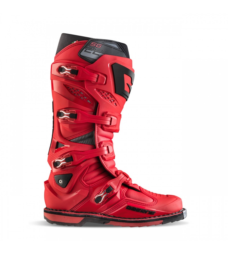 Gaerne MX SG 22 Η νέα Gaerne SG22 είναι εξέλιξη του best seller μοντέλου SG12. Κάθε στοιχείο και λεπτομέρεια της νέας SG22 έχει βελτιωθεί, συμπεριλαμβανομένου ενός νέου, τρισδιάστατου Main Body Toe Box που υιοθετεί μια τρισδιάστατη κατασκευή. Αυτή η νέα σχεδίαση φέρνει μείωση του ύψους μεταξύ της σόλας και της κορυφή του κουντουπιέ, αυξάνοντας την ταχύτητα και την ευκολία αλλαγής ταχυτήτων. Βεβαίως η SG22 έχει τέλειο ζύγισμα και το συνολικό της βάρος δεν είναι καθόλου αισθητό. Επίσης είναι πολύ πιο άνετες από τις SG12 και αυτό θα το καταλάβετε από την πρώτη βόλτα, διατηρώντας το μέγιστο βαθμό προστασίας του ποδιού σας !! Χαρακτηριστικά: Η βελτίωση της γεωμετρίας μιμείται την κίνηση του αστραγάλου. Το Dual Stage Pivot System προστατεύει τον αστράγαλο και περιορίζει την υπερέκταση, την υπερκάμψη και τις πλάγιες κινήσεις. Μπροστινή πλάκα κνήμης με δύο αεραγωγούς. Έγχυση αφρού μνήμης (Memory Foam). Inner Grip Guard: Αναπτύχθηκε σε συνεργασία με επαγγελματίες αναβάτες για βελτίωση της προστασίας και του συντελεστή τριβής για καλύτερη αίσθηση οδήγησης. Νέα σόλα Goodyear με ένθετα διπλής πυκνότητας για καλύτερο κράτημα, ανθεκτικότητα και αντικραδασμική προστασία. Η φτέρνα Microshock διαθέτει επίσης μια ένωση με διαφορετικές πυκνότητες σχεδιασμένη να παρέχει προστασία από μικροκρούσεις Πόρπη αλουμινίου Superlight Νέο ατσάλινο προστατευτικό μεταξύ της σόλας και του επάνω μέρους με μειωμένο πάχος σε σύγκριση με τα προηγούμενα μοντέλα, το οποίο διατηρεί την προστατευτική ικανότητα αλλά μειώνει το βάρος