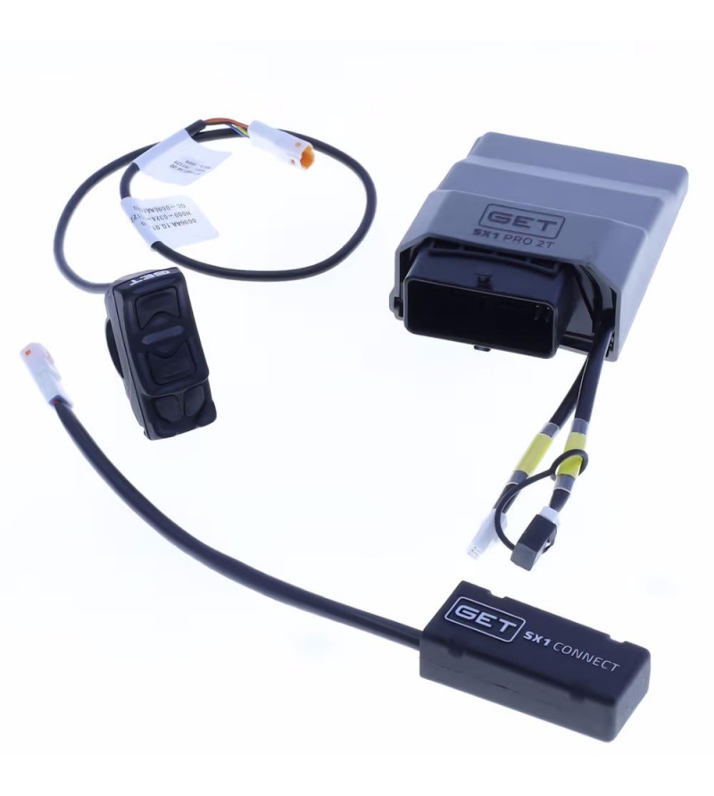 GET Performance Motorcycle SX1 Pro ECU Unit Controller – Suits 4 Stroke GET SX1 PRO is designed to optimize the potential of your bike while maintaining the same level of reliability and improving power delivery and distribution at all speeds. The control unit is a Plug & Play device. It can be installed simply and immediately directly on the main wiring of the motorbike without modifying the electrical system. The high performance of the new processor guarantees a significant increase in the processing speed of the data coming from the CPS (Shaft Position), TPS (Throttle Position), Exhaust Gas Valve Position, MAP (Intake Manifold Pressure), IAT (Temperature Intake Air), ECT (Coolant Temperature) for optimal management of advance degrees and injection times in all weather conditions and at all altitude levels. Wi-fi Module SX1 CONNECT is the most advanced Wifi module for connecting the control unit and a smartphone/tablet. It offers the possibility of customizing the key mapping parameters to adapt them to your driving style and the racing terrain in an easy and intuitive way: when used with the App With WiGET, you will be able to intervene in total safety on the injection and advance parameters, save the best settings for each situation and select them whenever you need them. Furthermore, through the integrated “Monitor” function, you can view operating and diagnostic data in real-time and the hours of use of the control unit. You can also obtain information on the status of the motorbike and schedule maintenance intervals. Multifunction handlebar SX1 CONTROLLER is your best ally in the quest for achieving absolute performance. It’s an innovative multifunction handlebar control that intuitively and immediately unifies all the functions to manage every aspect of riding in real-time. The seven integrated LEDs provide complete visual control over the selected engine maps and GPA traction control engage. Furthermore, the SX1 Controller monitor engine overheating, and activate Launch Control. Features and display modes can be customized via WiFi using the SX1 Connect, a device which is included in every SX1 PRO kit. FEATURES: Premium quality and high-performance UDS communication protocol based on CAN-BUS 2 Preinstalled Racing maps Integrated Traction Control (GPA technology) and compatible with electronic Launch Control (LC-GPA device) Power Maximization Multifunction control SX1 Controller and SX1 Connect WiFi module included in the kit Used by Factory Race Teams all over the world Components, production phases and quality controls derived from OEM Plug & Play Completely programmable via Wi-GET App and MAYA software Image for reference only product may vary slightly.
